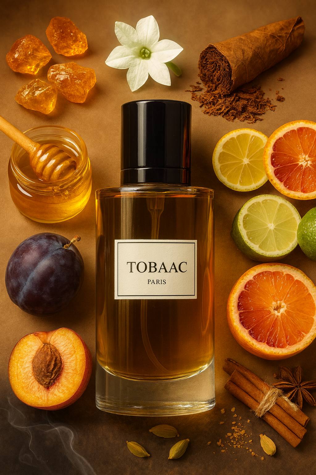 در شروع، ترکیبی لطیف از مرکبات در کنار میوههای آبدار مانند آلو و هلو حس شیرینی ملایم و جذابی ایجاد میکند. در قلب رایحه، گل تنباکوی سفید در کنار تنباکوی غنی و طبیعی، فضایی گرم، مخملی و عمیق میسازد. در نهایت، عسل کهربایی و روایح دودی، عطری ماندگار، دلنشین و بسیار خاص را روی پوست بهجا میگذارند.